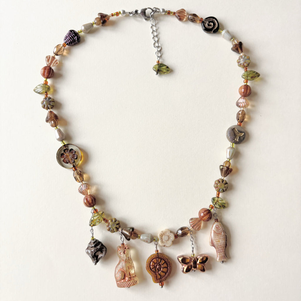 -made with glass beads (including czech glass), stainless steel wire, chain & clasp, and minor silver-plated and sterling silver components