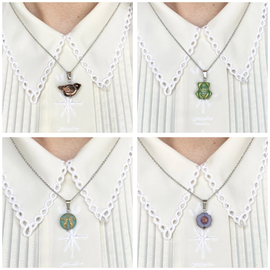 -made with a czech glass bead pendant and stainless steel chain, wire and clasp. finished in the back with faceted czech glass beads